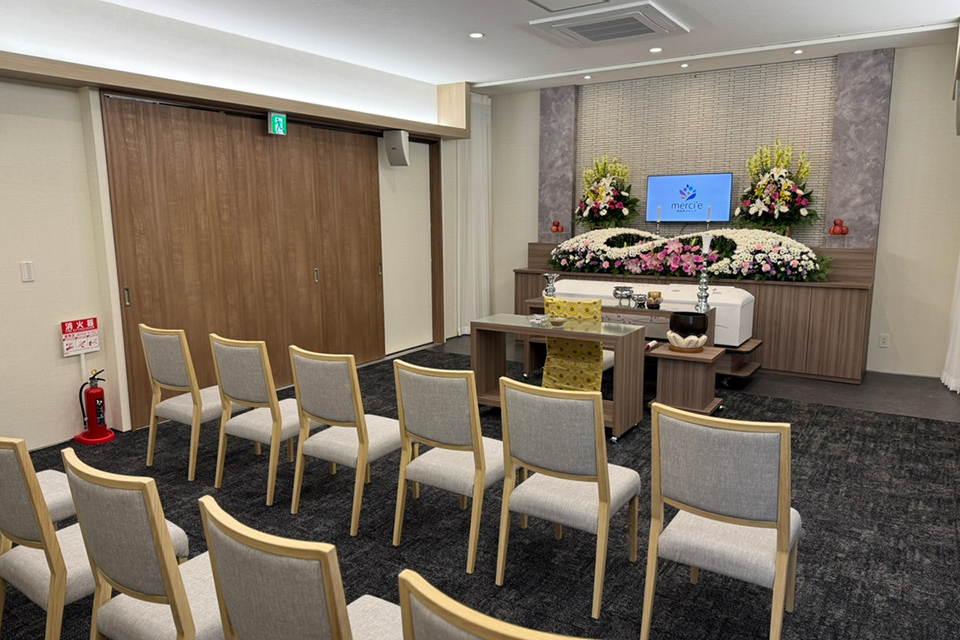 近年主流となりつつある家族葬のニーズにお応えするために誕生した式場です。ご親族やご親戚の皆様が故人様とのお別れを静かで温かみのある空間でお過ごしいただけるよう、葬儀会館のイメージを一新した空間をご提供しております。会場は20席を基本としており、落ち着きのある雰囲気の中でお見送りいただけます。また、人数が増えた場合には椅子の追加が可能で、最大30名様まで対応可能です。